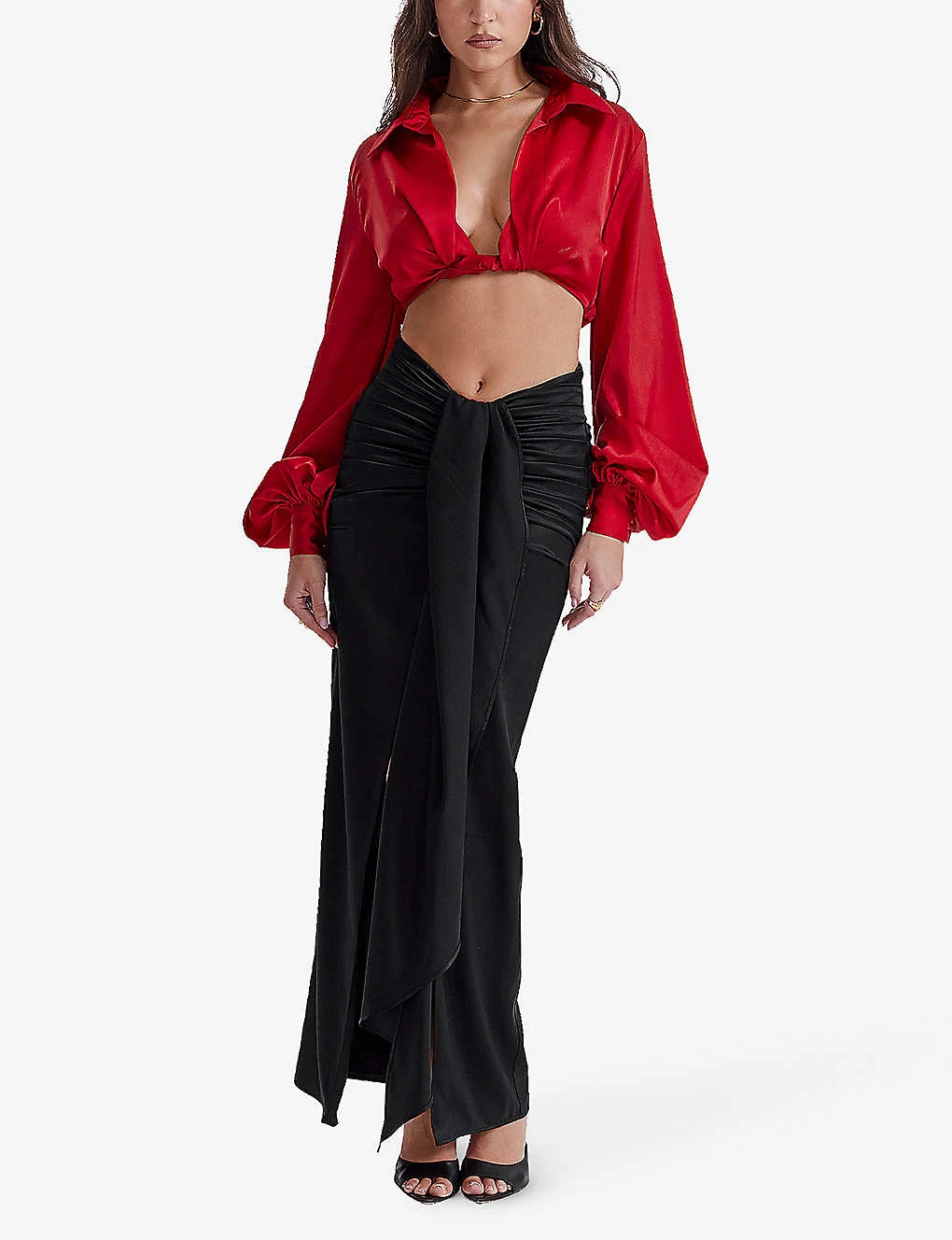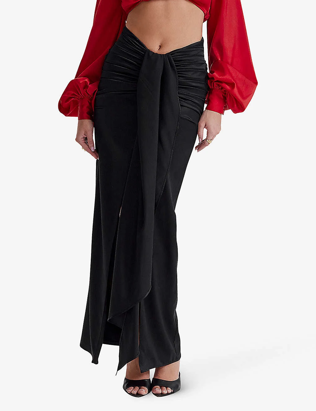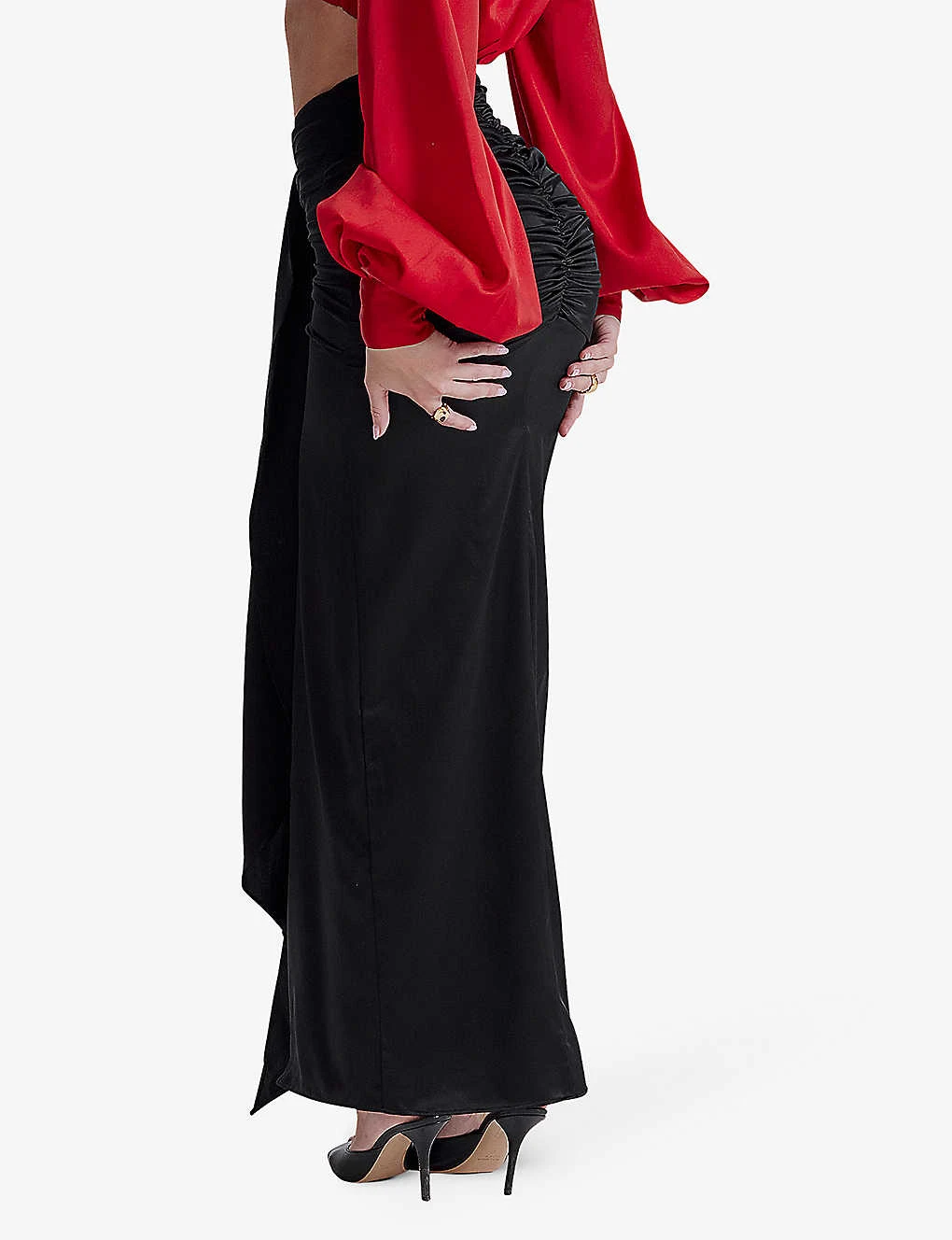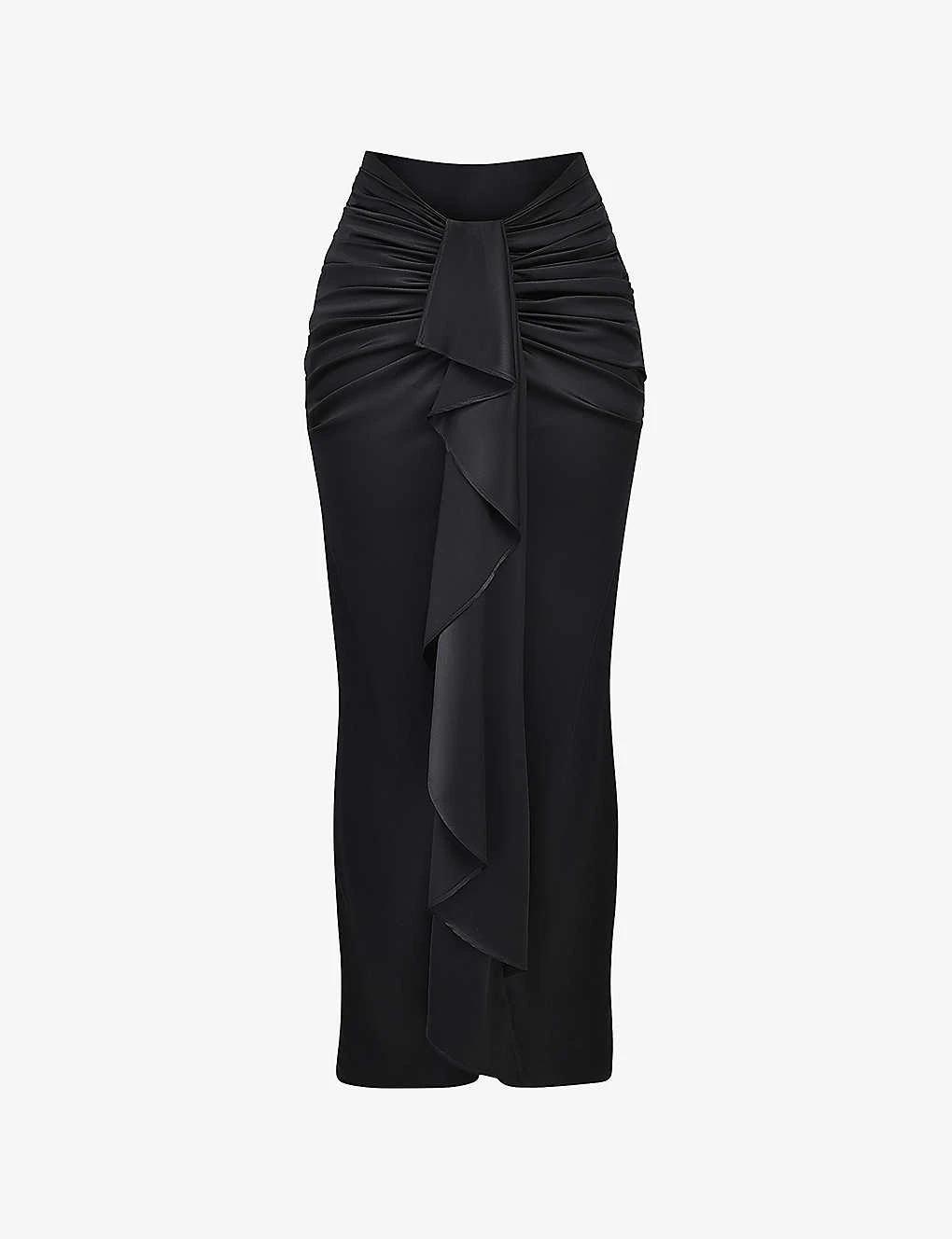 - Slim fit, mid-rise, ruched design, front draping, front slit, maxi length, fully lined