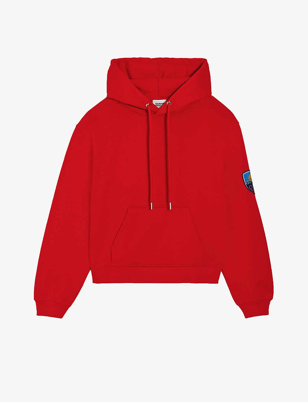 - Hooded, long sleeves, embroidered logo-patch at the sleeve, cropped silhouette, kangaroo pocket, ribbed hem