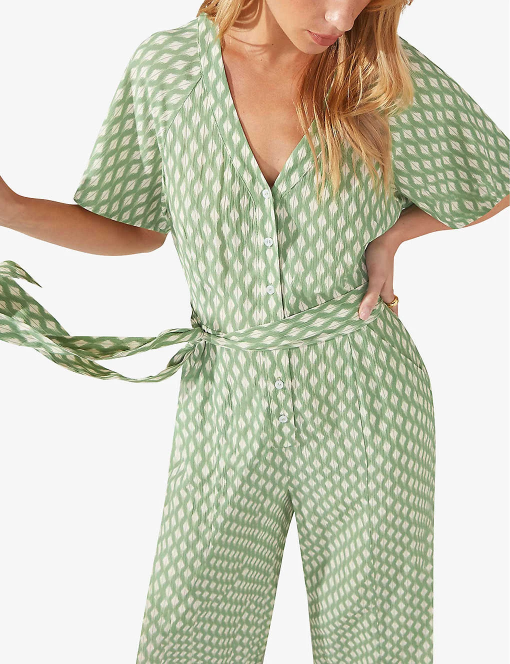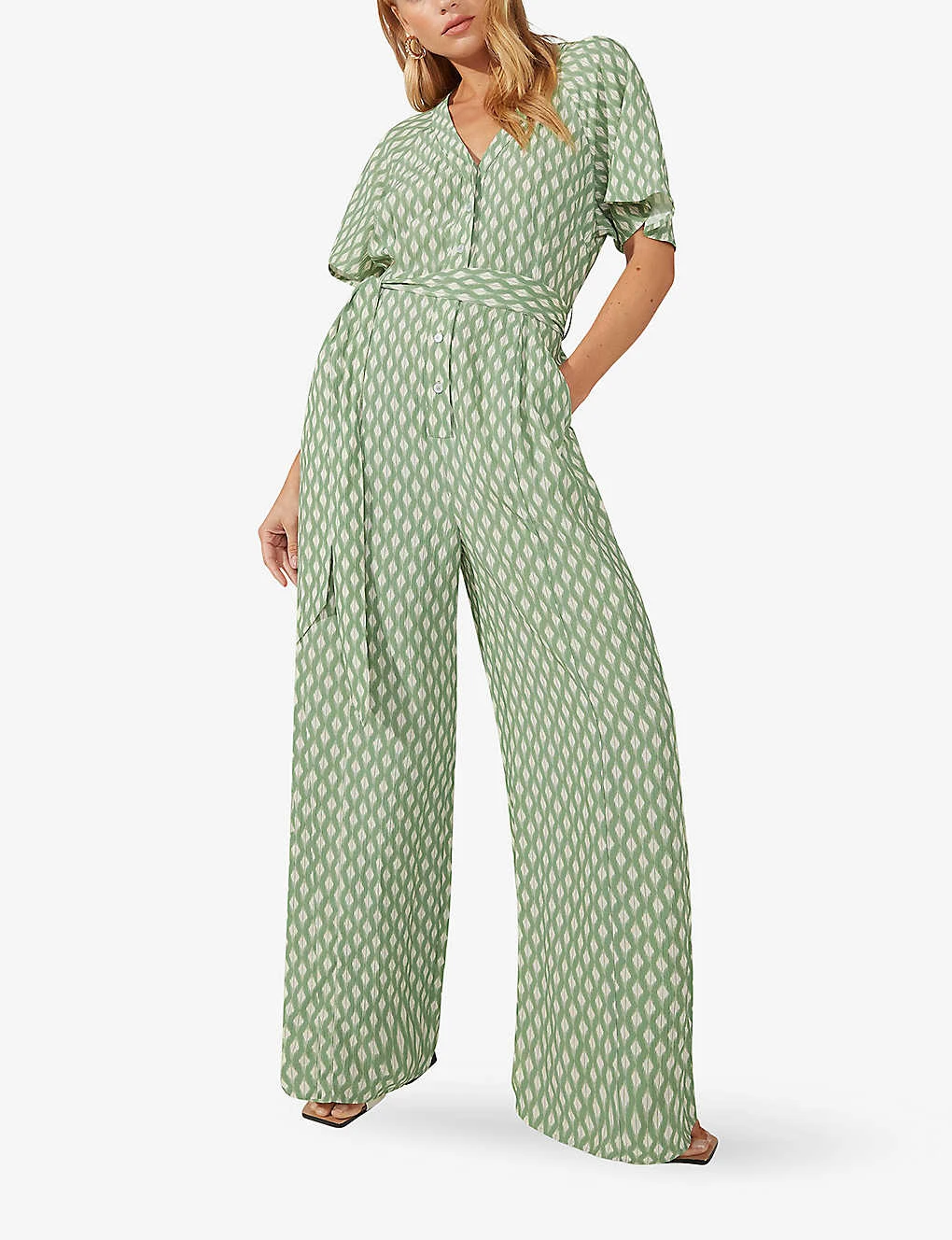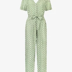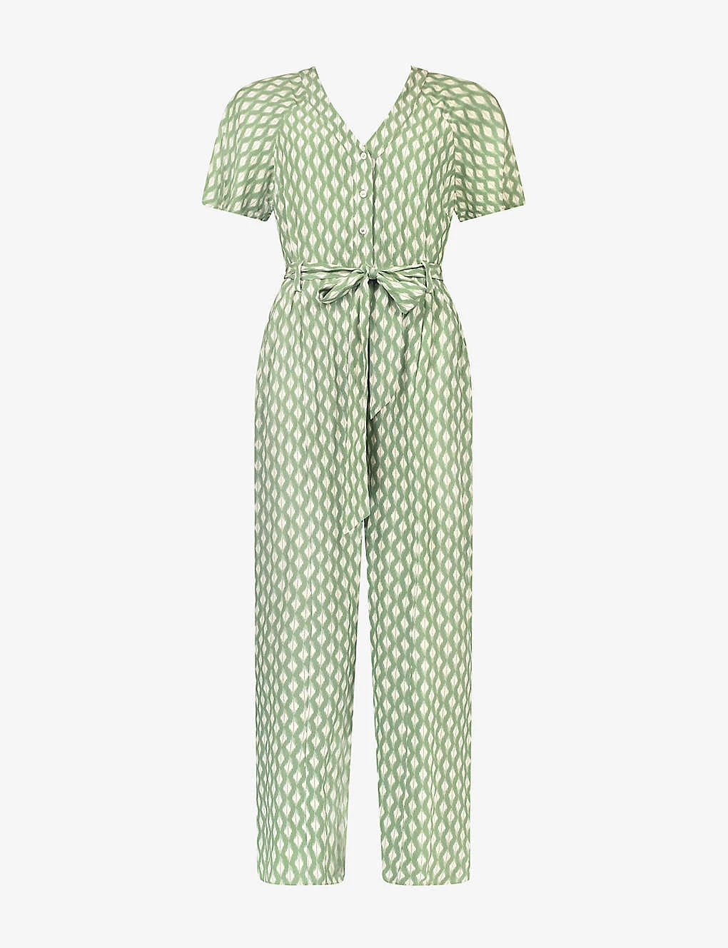 - V-neck, short sleeves, all-over diamond print, belt loops, detachable self-tie fastening belt at front, two slip pockets at front, wide leg