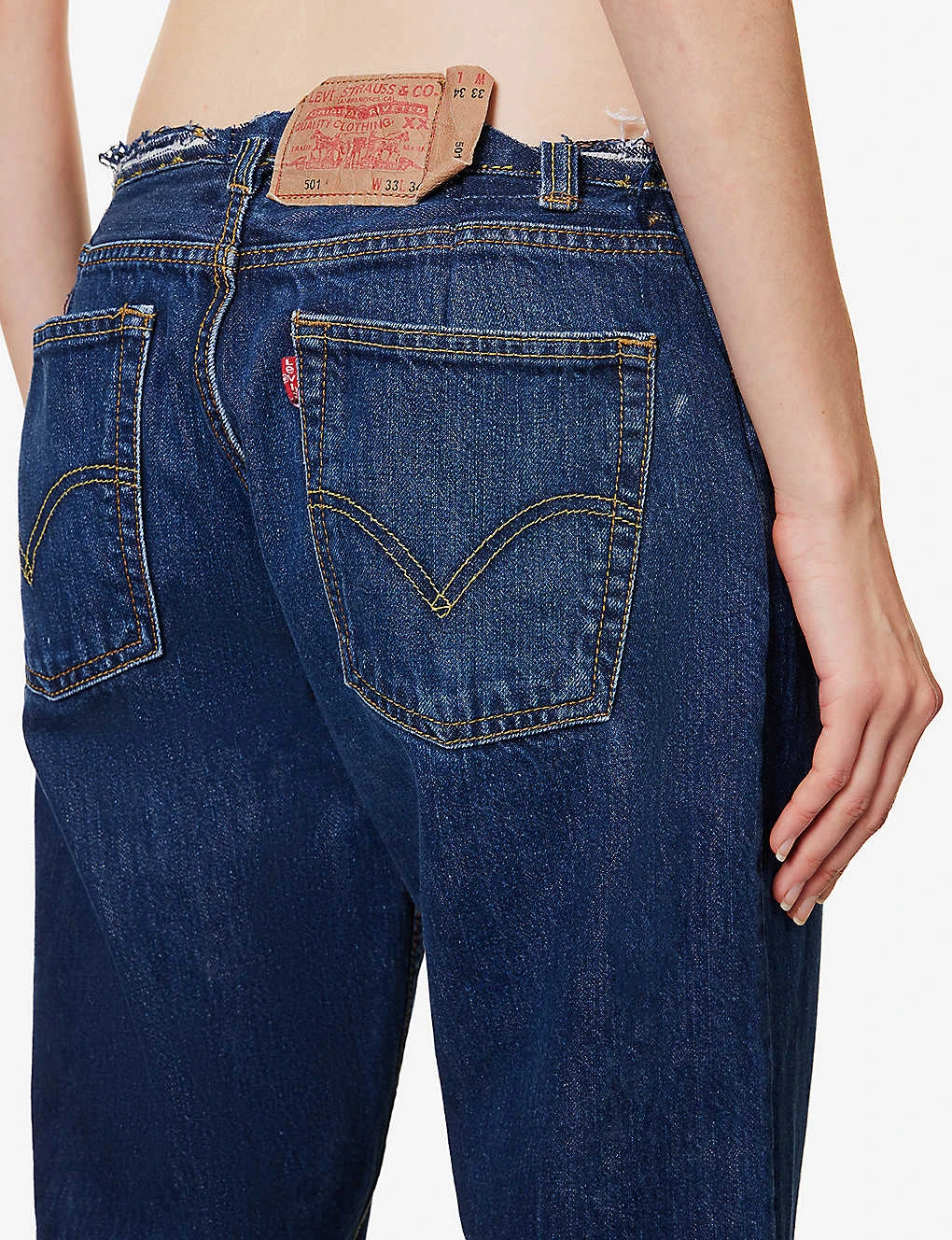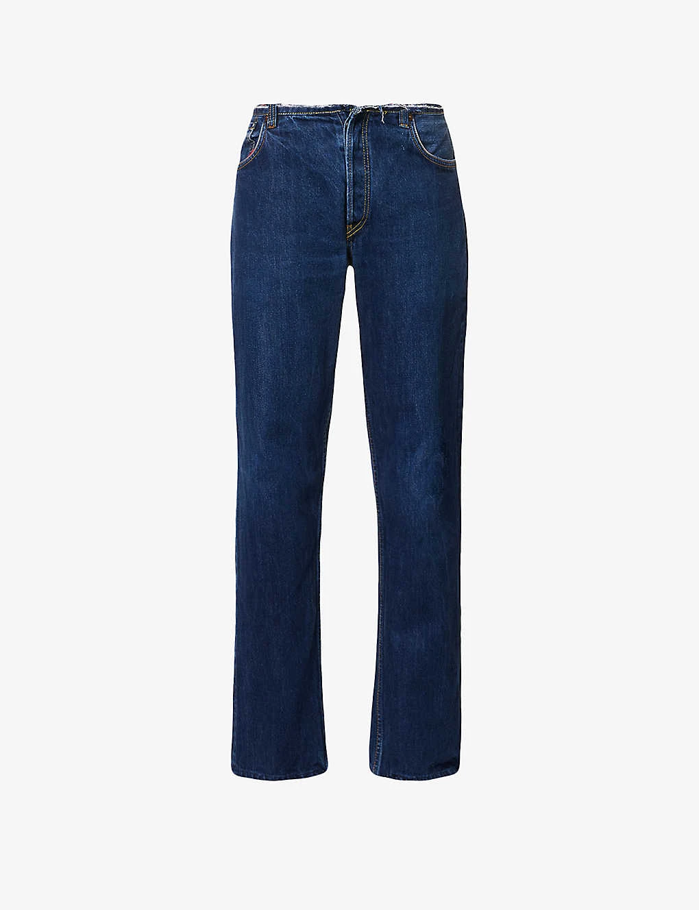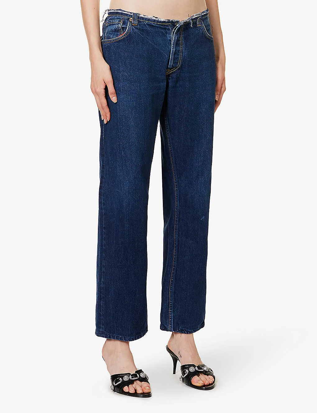 - Low-rise, raw hem at waist, flared leg, five pockets, brand patch at back, branded hardware, partially lined