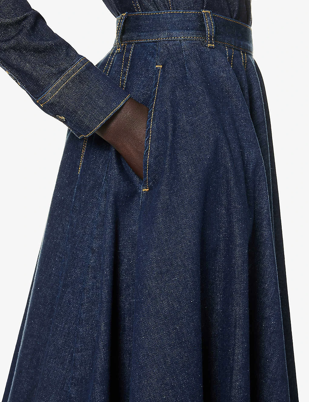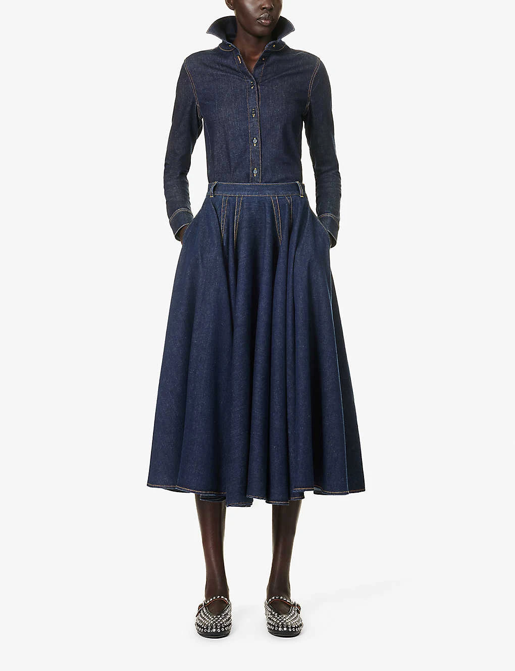 Flared-hem Contrast-stitching Stretch-denim Midi Skirt