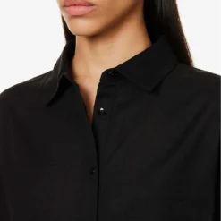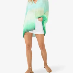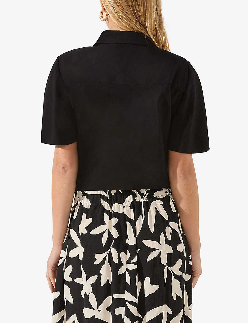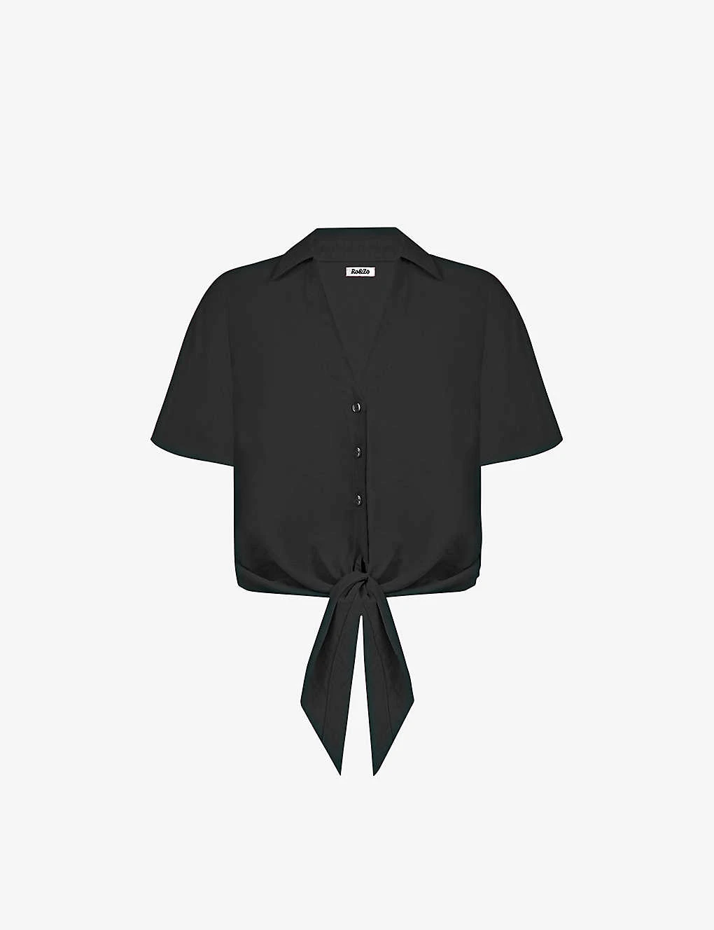 - Relaxed fit, short flutter sleeves, button front, self-tie hem