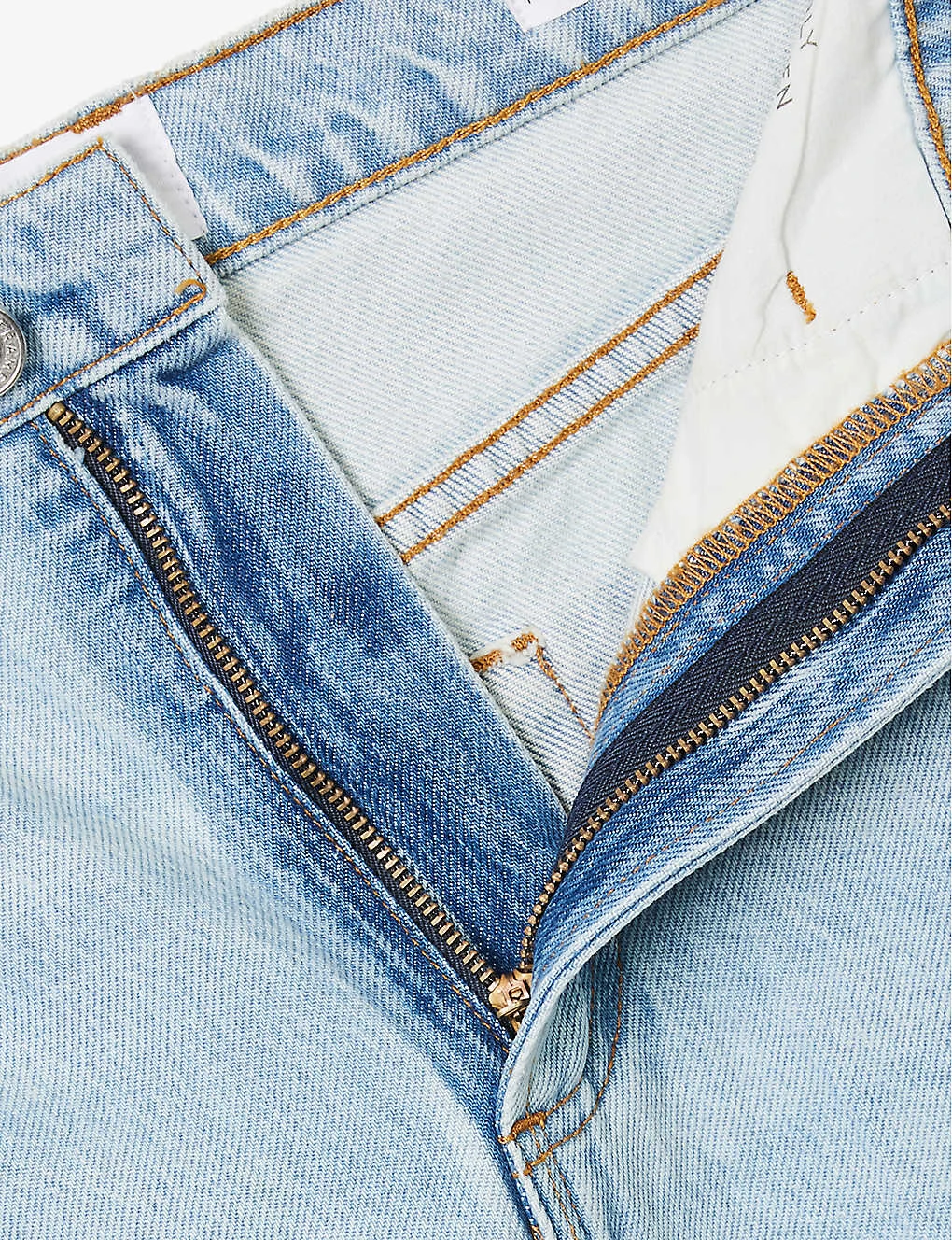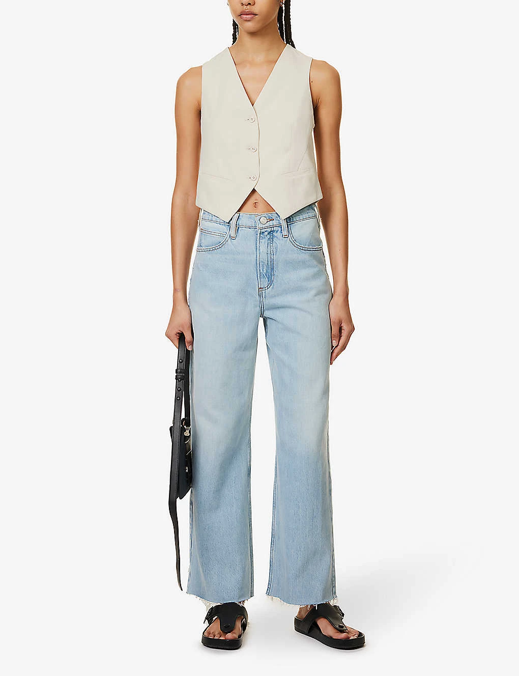 - Regular-fit, high-rise, wide leg, belt loops, five pockets, branded silver-toned hardware, all-over faded wash, V-shaped yoke at back, raw hems