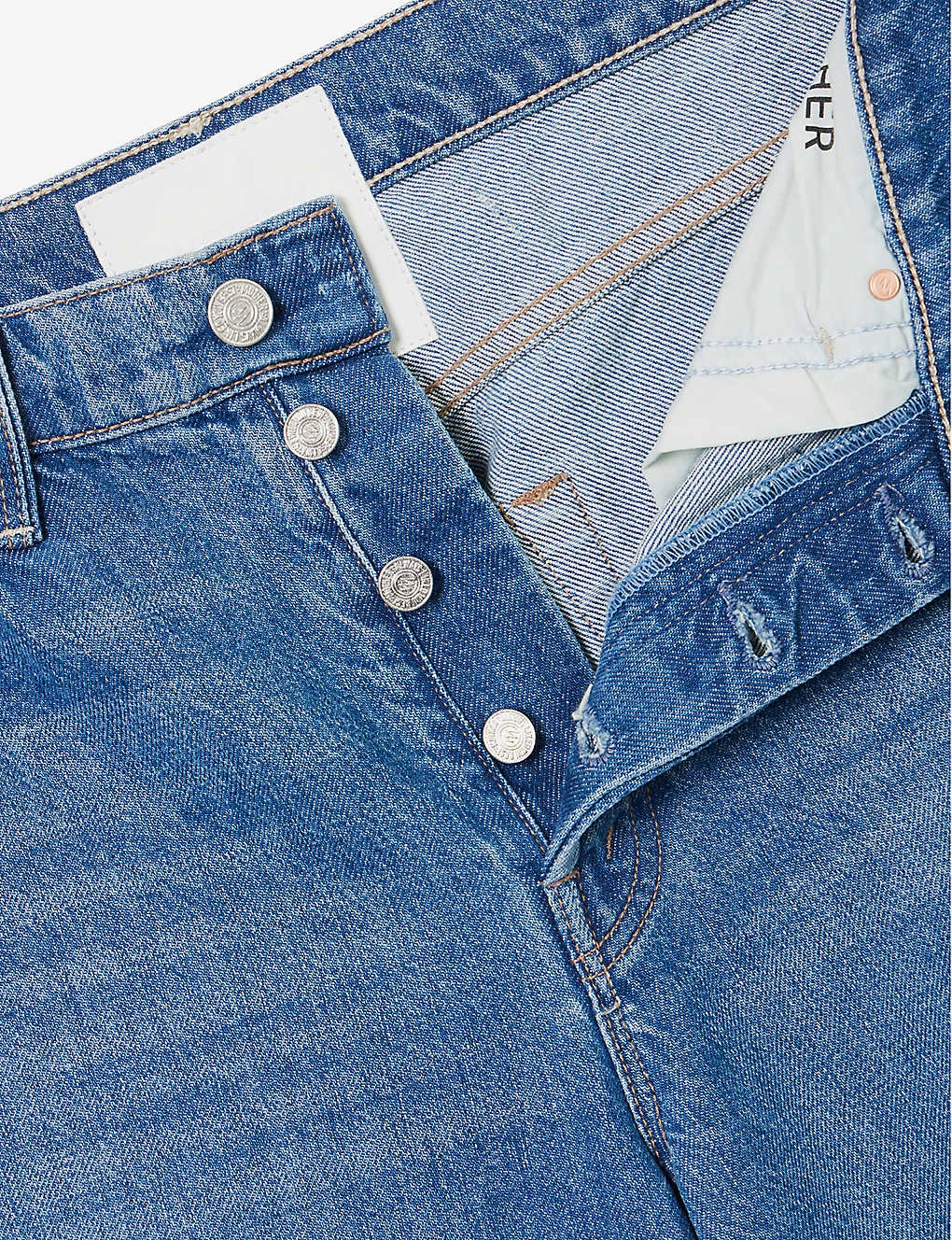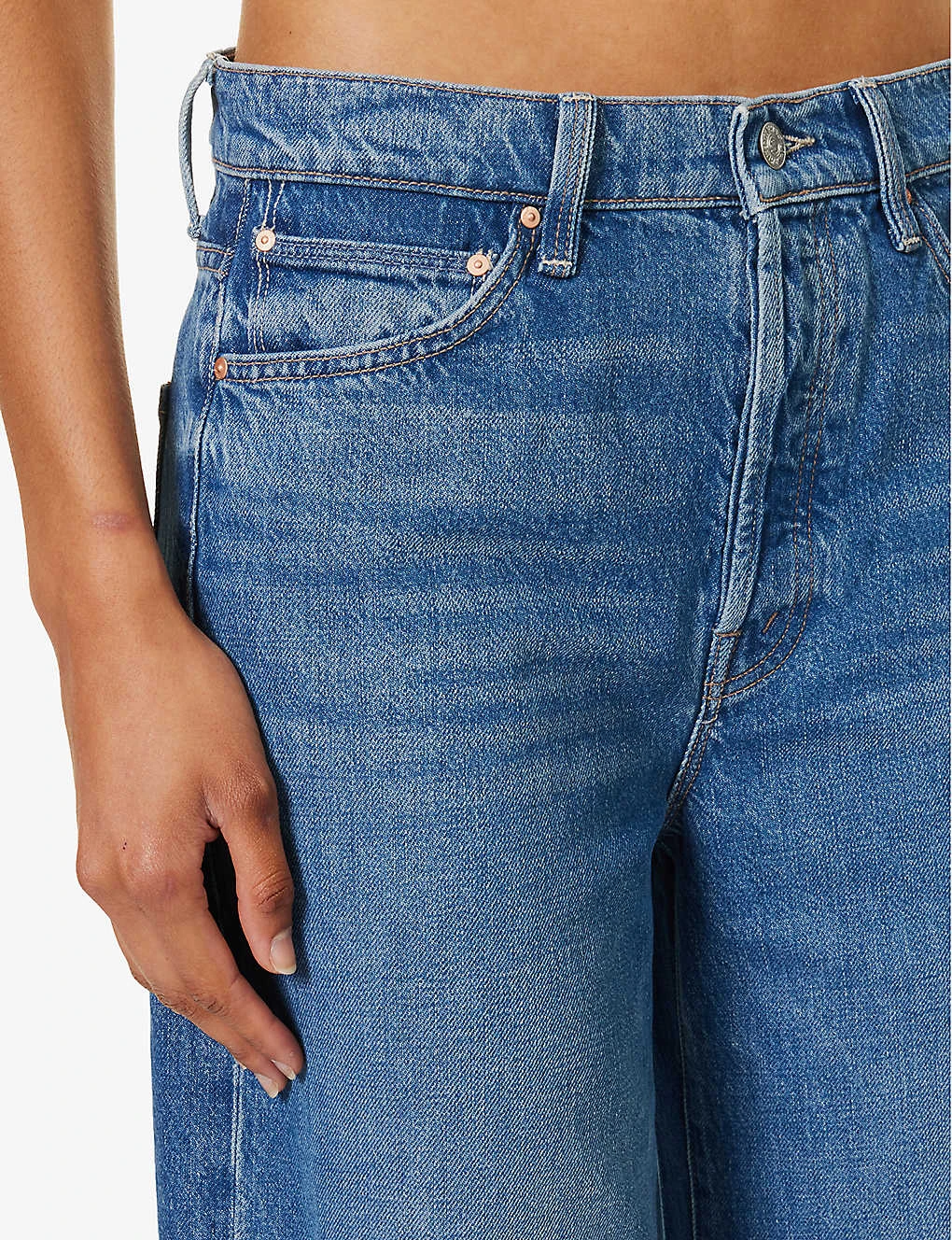 - Regular fit, high rise, wide leg, belt loops, five pockets, whiskering and faded wash, brand tab at back waist, V-shaped yoke at back, embroidery at back pockets