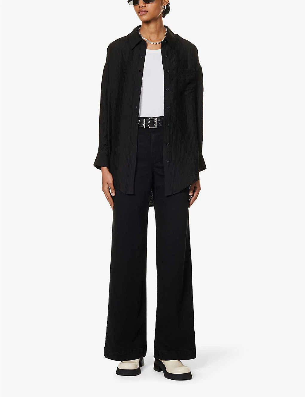 - Regular fit, high rise, wide leg, belt loops, five pockets, branded hardware, pressed centre creases, brand patch at back