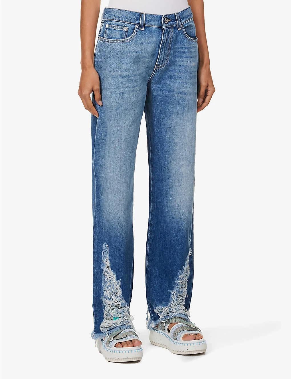 - Regular fit, mid-rise, straight leg, structured waistband with belt loops, five pockets, curved yoke at back, brand patch at back, mid-faded wash, contrast stitching, distressed hems, silver-toned hardware