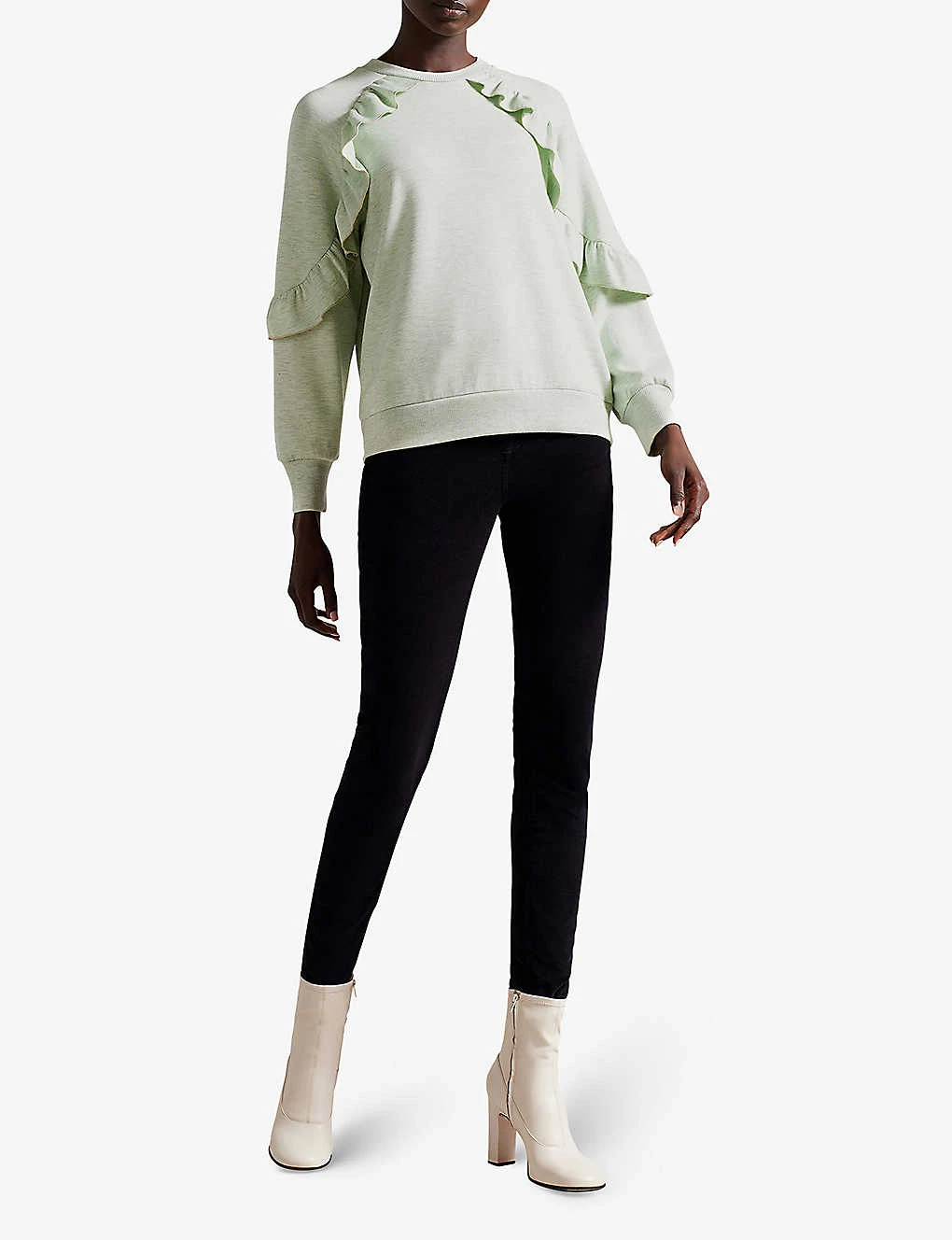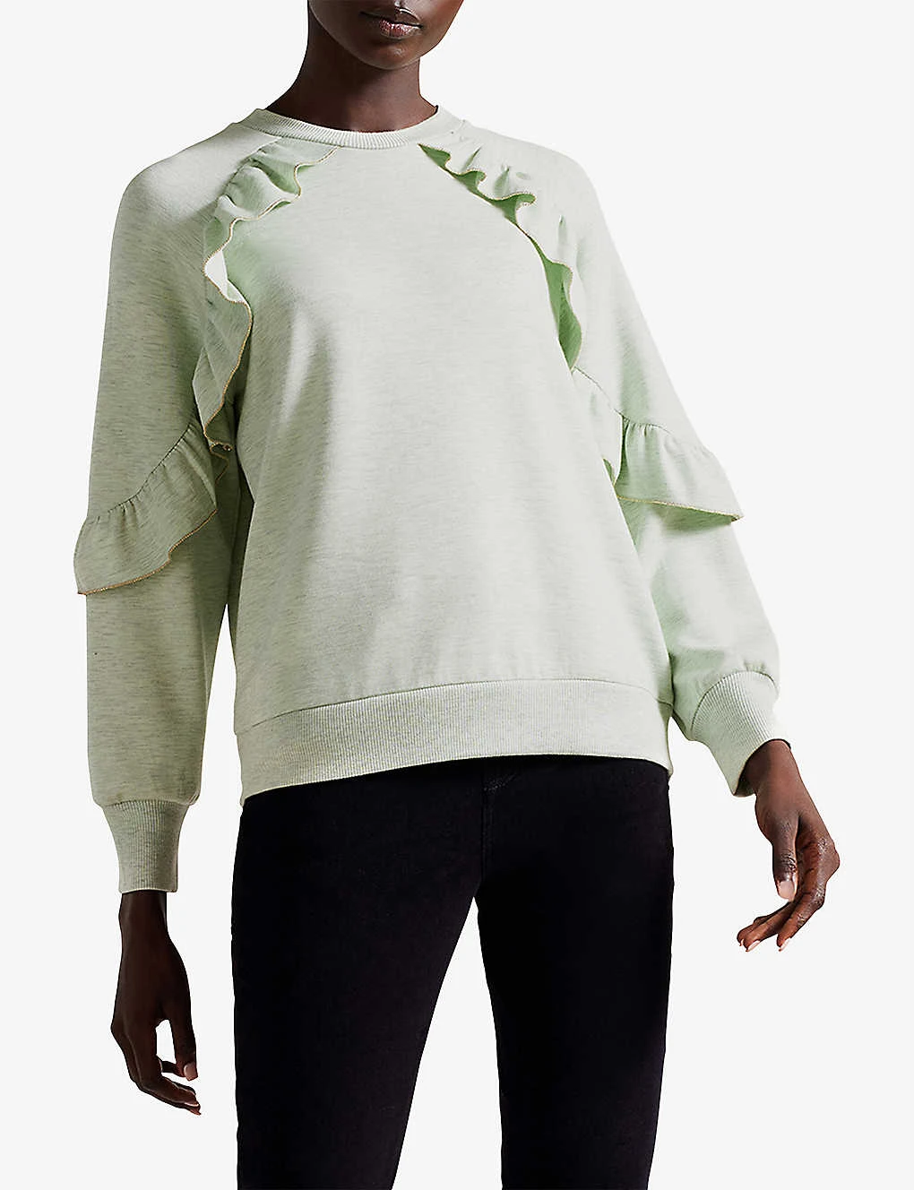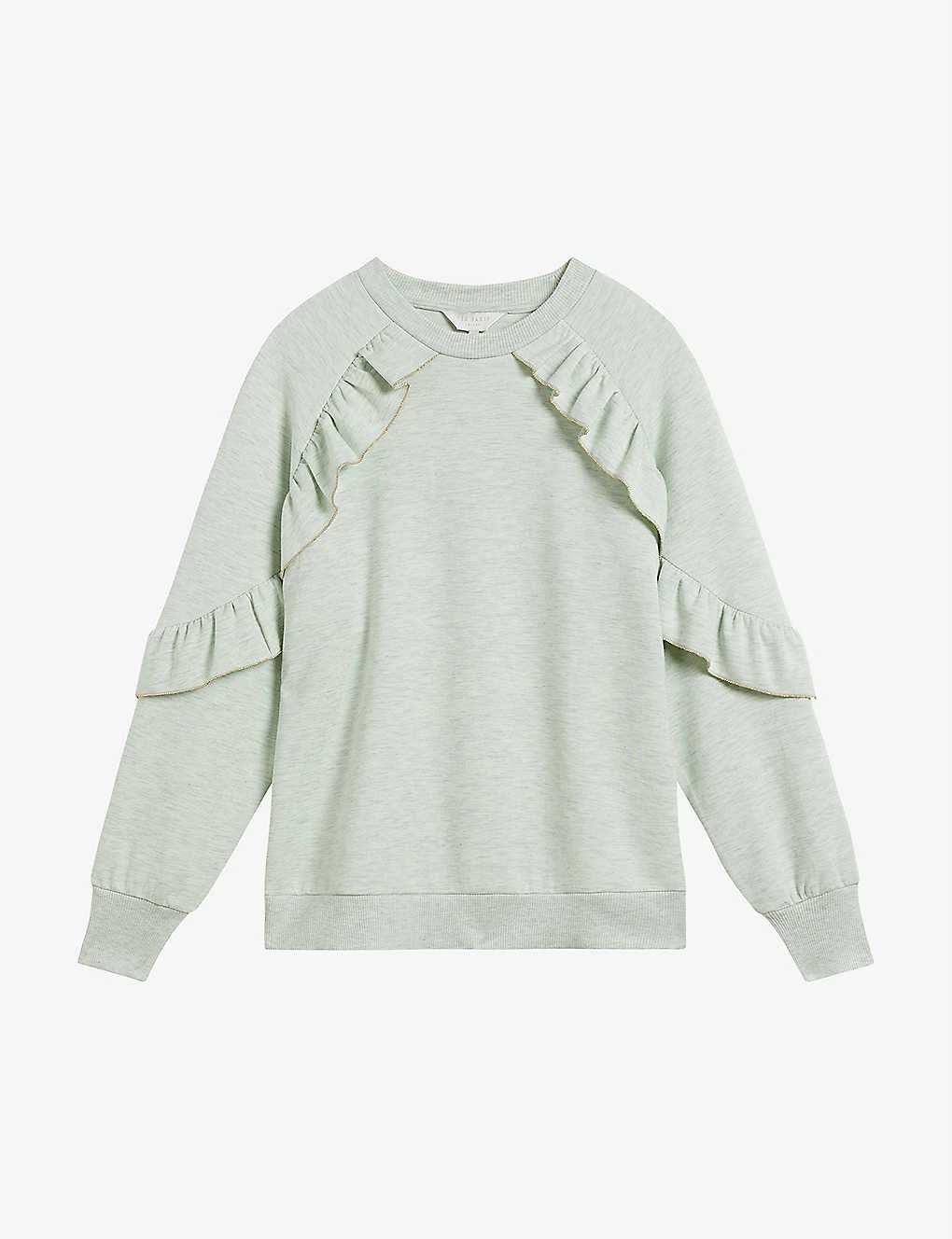 - Relaxed-fit, round neck, long sleeves, tiered frills at collarbone and elbow, ribbed trims, embroidered magnolia branding